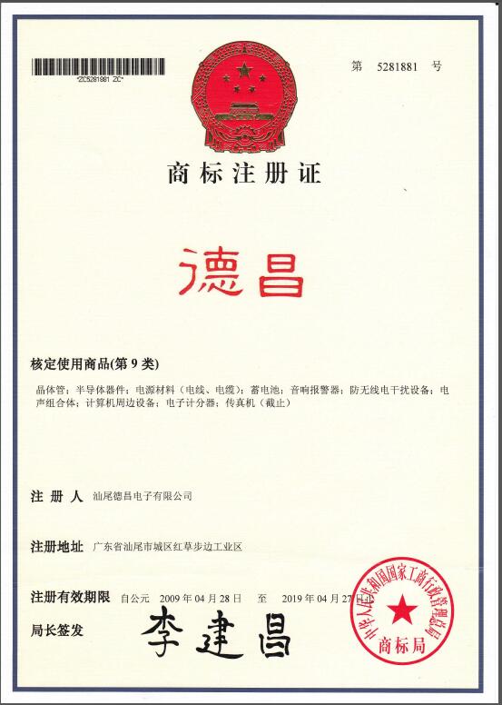 是汕尾德昌電子有限公司在中國的注冊商標之一,受法律保護,侵權必究。